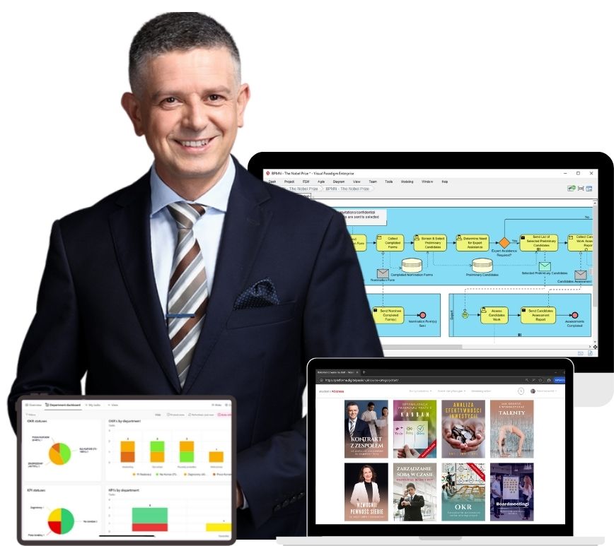 - zeszyty ćwiczeń (BPMN, kompetencje lidera, Kanban,..), które prowadzą Cię od diagnozy do efektu.