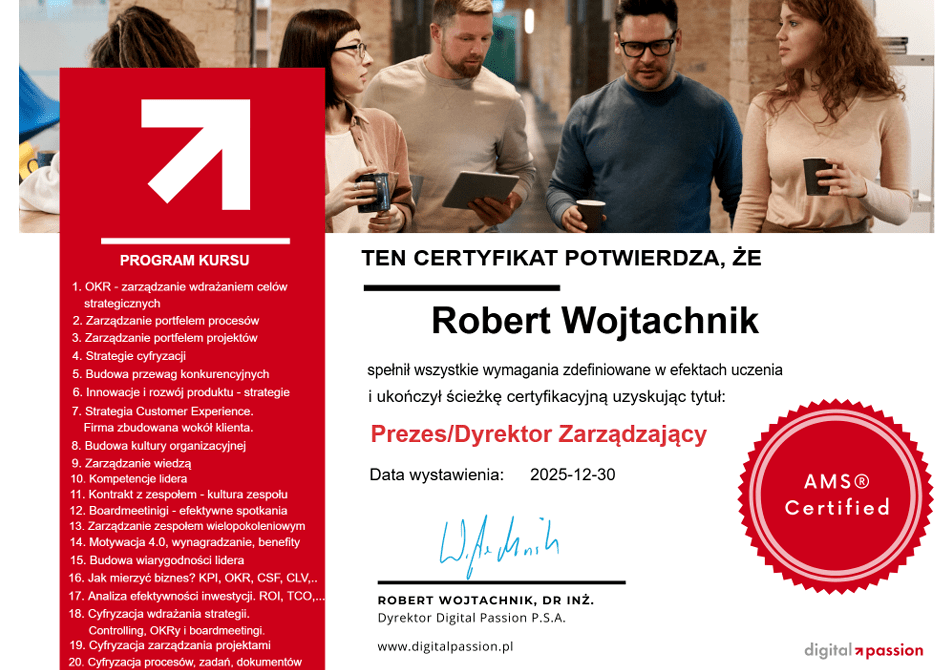 Dzięki tym szkoleniom otrzymujesz kompetencje do skutecznego projektowania i wdrażania strategii, zarządzania portfelem procesów i projektów, podejmowania decyzji w oparciu o dane oraz budowania przewag konkurencyjnych i prowadzenia organizacji przez cyfryzację i rozwój. Po zakończeniu dostajesz certyfikat „Prezes/Dyrektor Zarządzający” — dokument potwierdzający, że potrafisz przełożyć wiedzę na praktyczne działanie i realne efekty biznesowe.