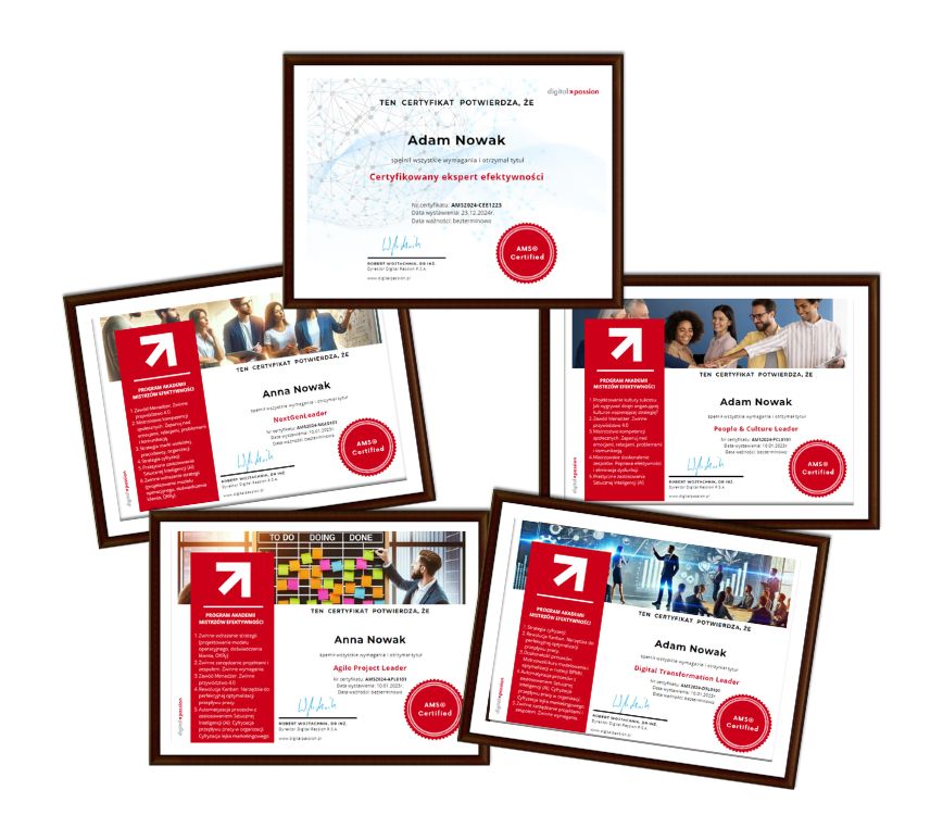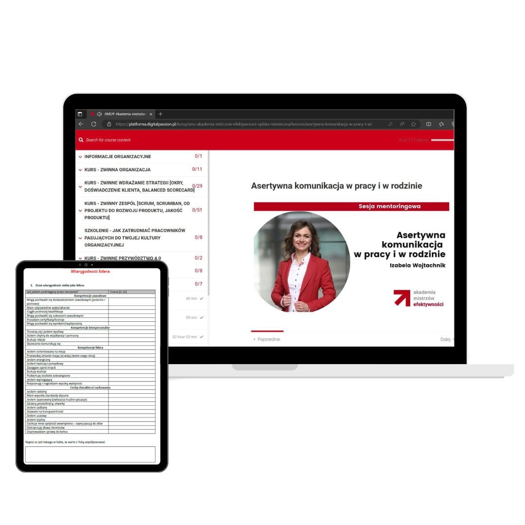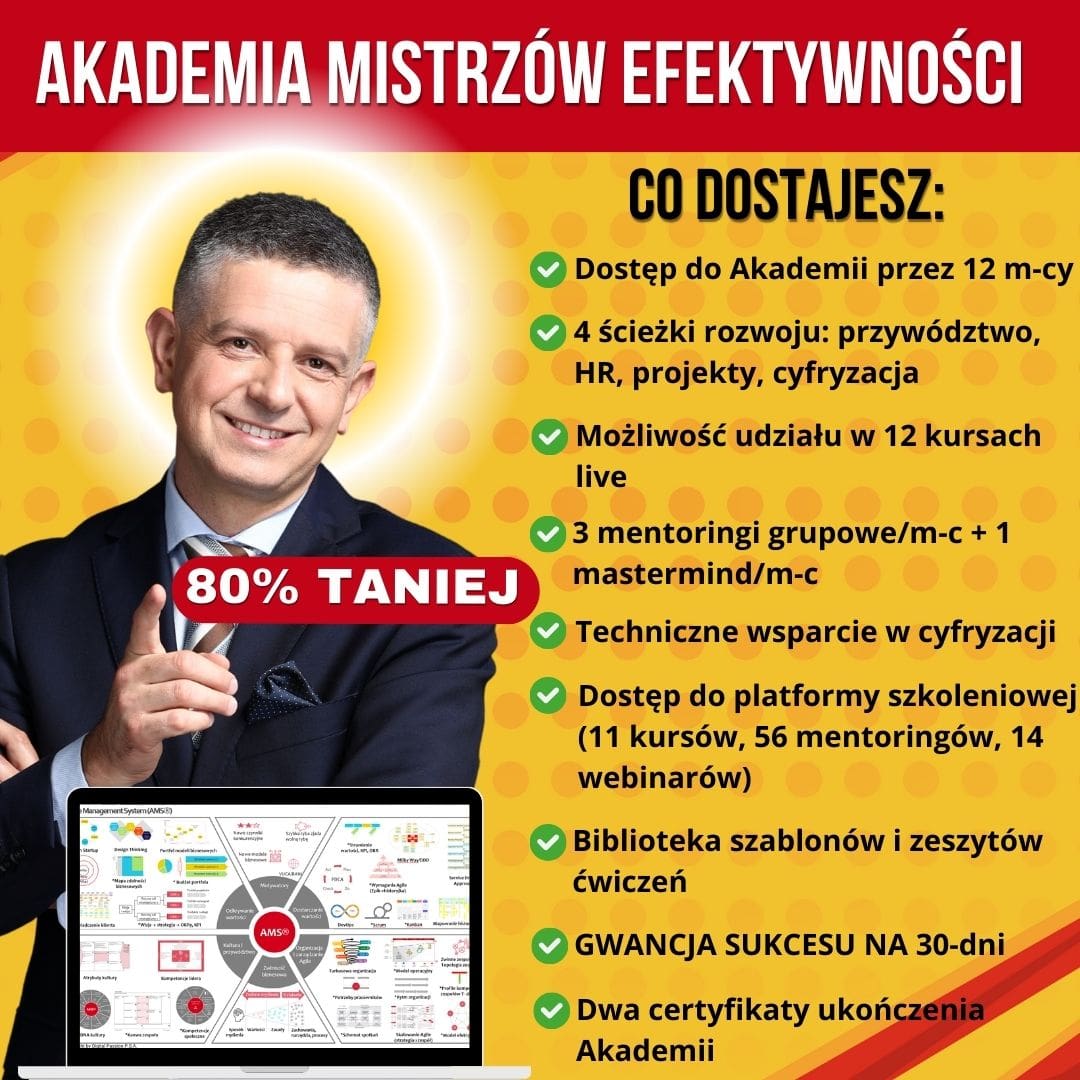 Naucz się jak poprawić efektywność całej organizacji (dowożenie celów, procesy, zespoły, kultura, komunikacja, współpraca, projekty, przywództwo, efektywność osobista, cyfryzacja, automatyzacja, AI). Poznaj Agile Management System – AMS®.